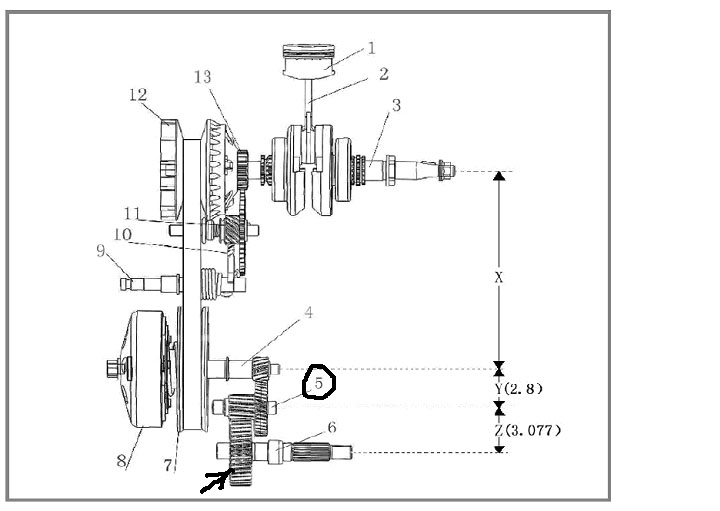 Сии цифири есть не что иное, как количество зубьев на ведущей/ведомой шестернях. См. рисунок внизу. Вал с двумя шестернями (на рисунке позиция 5) – это есть ведущая. Опять же применительно к МАЛЕНЬКОЙ шестерни на этом валу. Большая относится к предыдущей паре и нас не интересует и далее не рассматривается.
