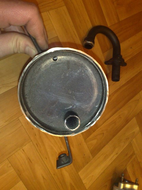 Сегодня сварил глушитель. Вот, что получилось. В месте отмеченной красной стрелкой можно было не резать. Внутренний конус, лучше не выламывать изнутри, потом долго придется шарошками пилить. Гораздо легче снаружи высверлить три точки сварки, и потом аккуратно заварить, и зачистить снаружи. Загнутая труба отмеченная белой стрелкой, была заменена на более толстую, с внутренним диаметром 18мм. И потом покрасил. Как это будет работать не знаю. Проверим только Весной.