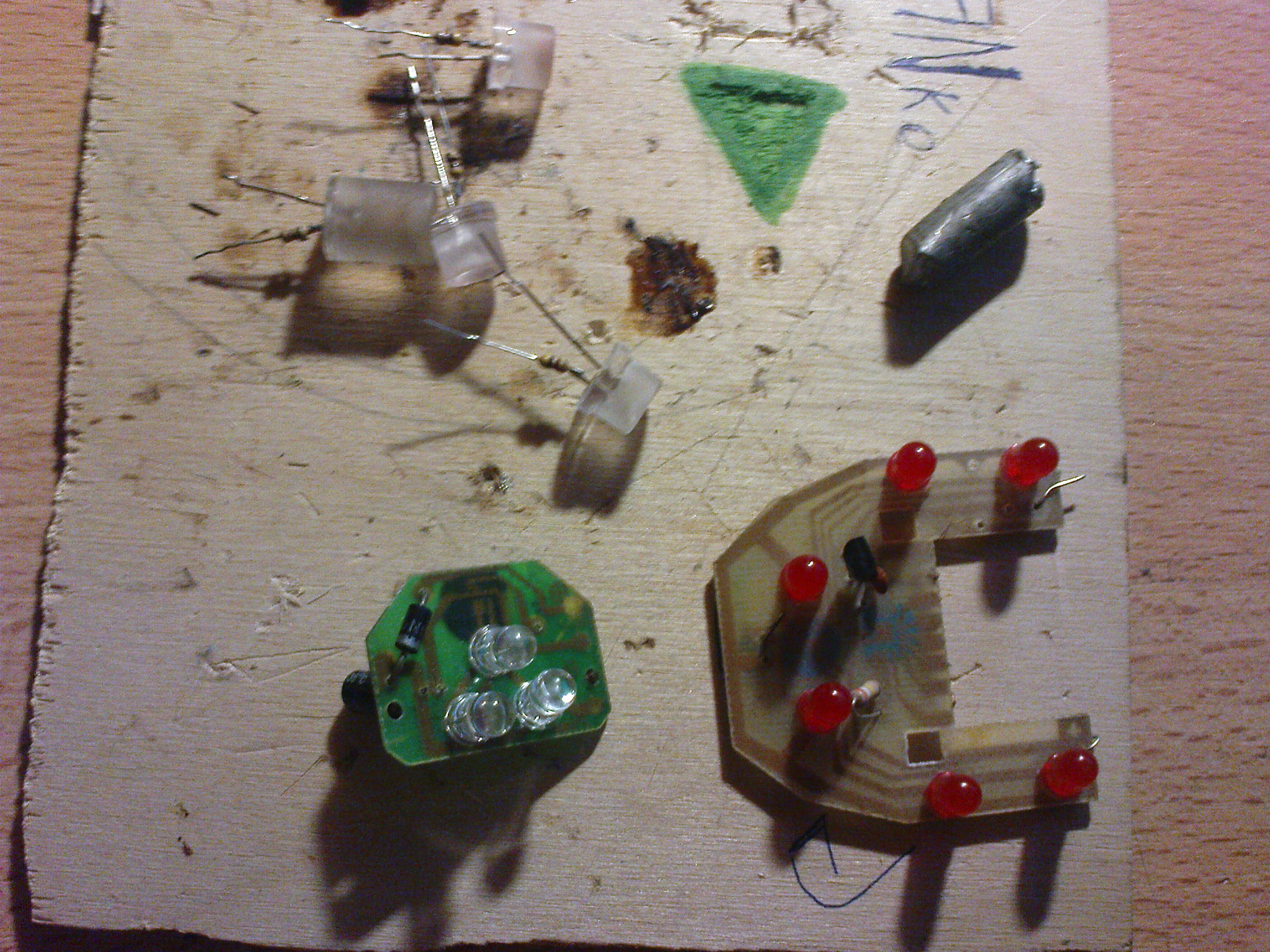 Всем Привет! Все начилось с уборки в гараже, Откопав там : Платы с белыми и красными светиками, Светодиоды с резисторами. Я взял их домой захватив с собой паяльник и все прочее к нему. Выпаяв светодиоды с плат я принялся за отпайку резисторов. Вычислив где плюс а где минус у отпаянных светиков я припаял к ним резисторы Все кончилась кислота для пайки. День 2. Сходив на учебу я заскочил домой за ключами от гаража и "кузи" , Отправился в Гараж. Снял все поворотники и отправился на поиски кислоты , в ближайшем хоз маге её не оказалось(. Ладно! Я вернулся в гараж забрать поворотники и на обратном пути домой я заглянул к соседям мебельщикам (Спросить кислоту) у них ее тоже не оказалось. НО СТОП! Вспомнив что канифоль делают из древесной смолы я жадно стал отрывать ее у них с сосновых досок. Пришел домой включил паяльник ушел пить чай. Допаял что не успел вчера. Разобрал поворотники и сделал дырку отверткой xDD. Вставил светодиод и чуть подмазал его драконом (Клей такой). Подключил к зарядке от телефона SE опа засветился. Ходил по квартире в поисках 12v ( ну чтоб проверить не сгорит ли) на взгляд мне попался блок питания радио-телефона , вот они наши 12 в , проверил все горит. Пришел в гараж поставил поворотники и долго думал откуда же мне запитать все это дело. Воуля жгут проводки вычислив метотам тыка (контролькой) провод габаритов(коричневый) я прифигачил все к нему. Ах забыл минус у нас идет на минус лампочки поворотника) вот и фоты: Меня не пинать писал 1 раз!