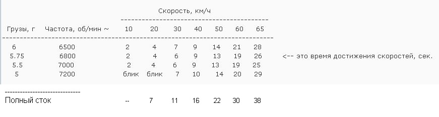 Кстати, об успехах ат маих бисграматных действий. Где-то выше давал ссылку на ролик, где отснял показания ЖПС и штатного спидометра. Я там разгонялся на полном газу еще до каких-либо доработок вариатора, на полном стоке. Сегодня отхронометрил достижение ряда скоростей так же, как это делал недавно при настройках несколько доработанного вариатора. Таблицу результатов вывешивал на днях. Теперь дополнил данными по прошлогоднему заезду на стоке. Ничё так изменения, заметны.
