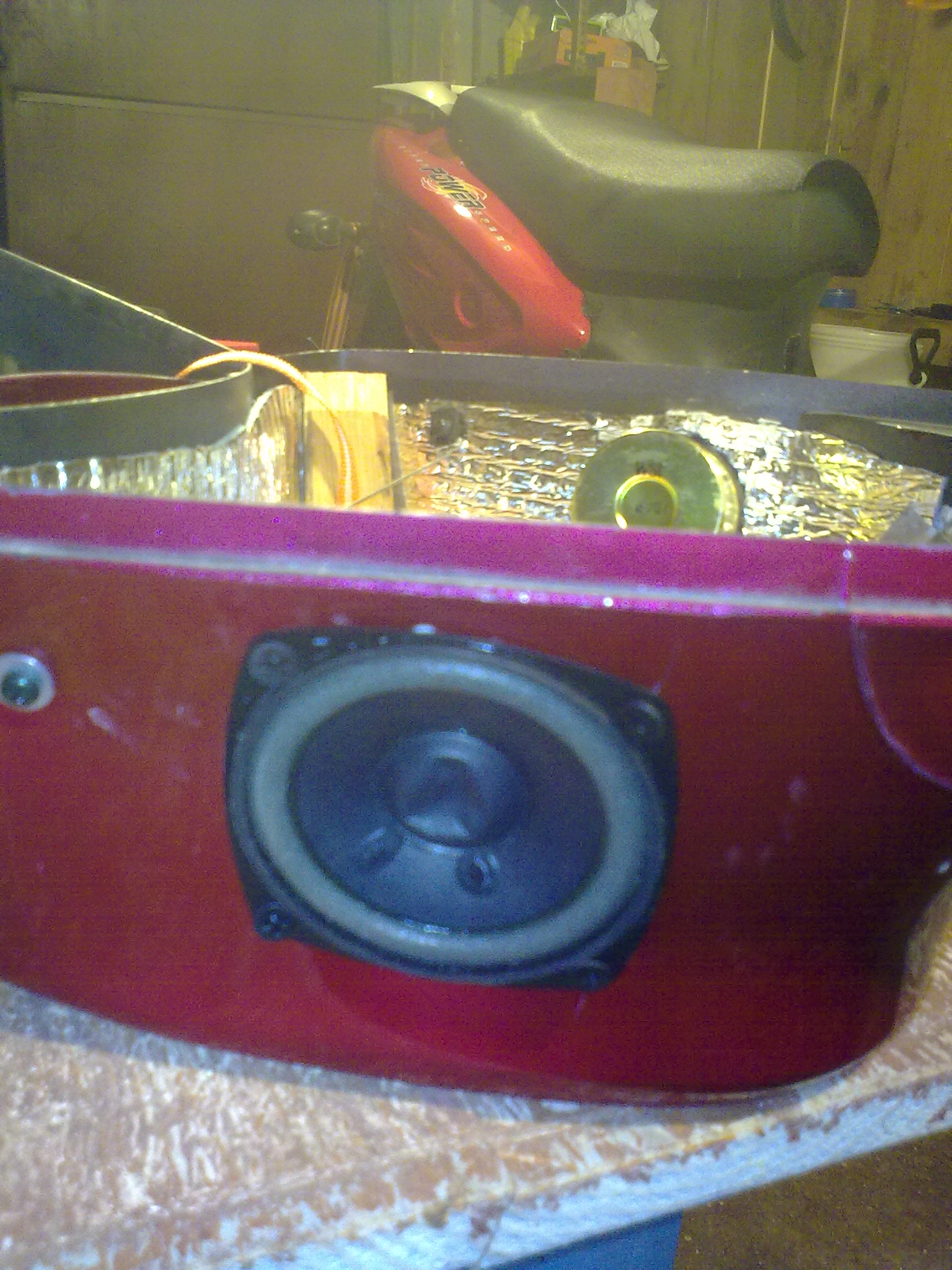Да придеться пожертвовать багажником под сидением. но если чесно он и так маленький - шлем в него не помещается. А на крайняк можно со второго скутера поставить багажник место этого. Как вы знаете установить усилитель и пищалки, даже СЧ динамики особо проблем нет но вот беда нет места для низких частот. Вот я и решил сделать самодельный саб. Правда я только достаю материал, а профессионалы будут расчитывать фильтра, обьем, фазоинвертер,...