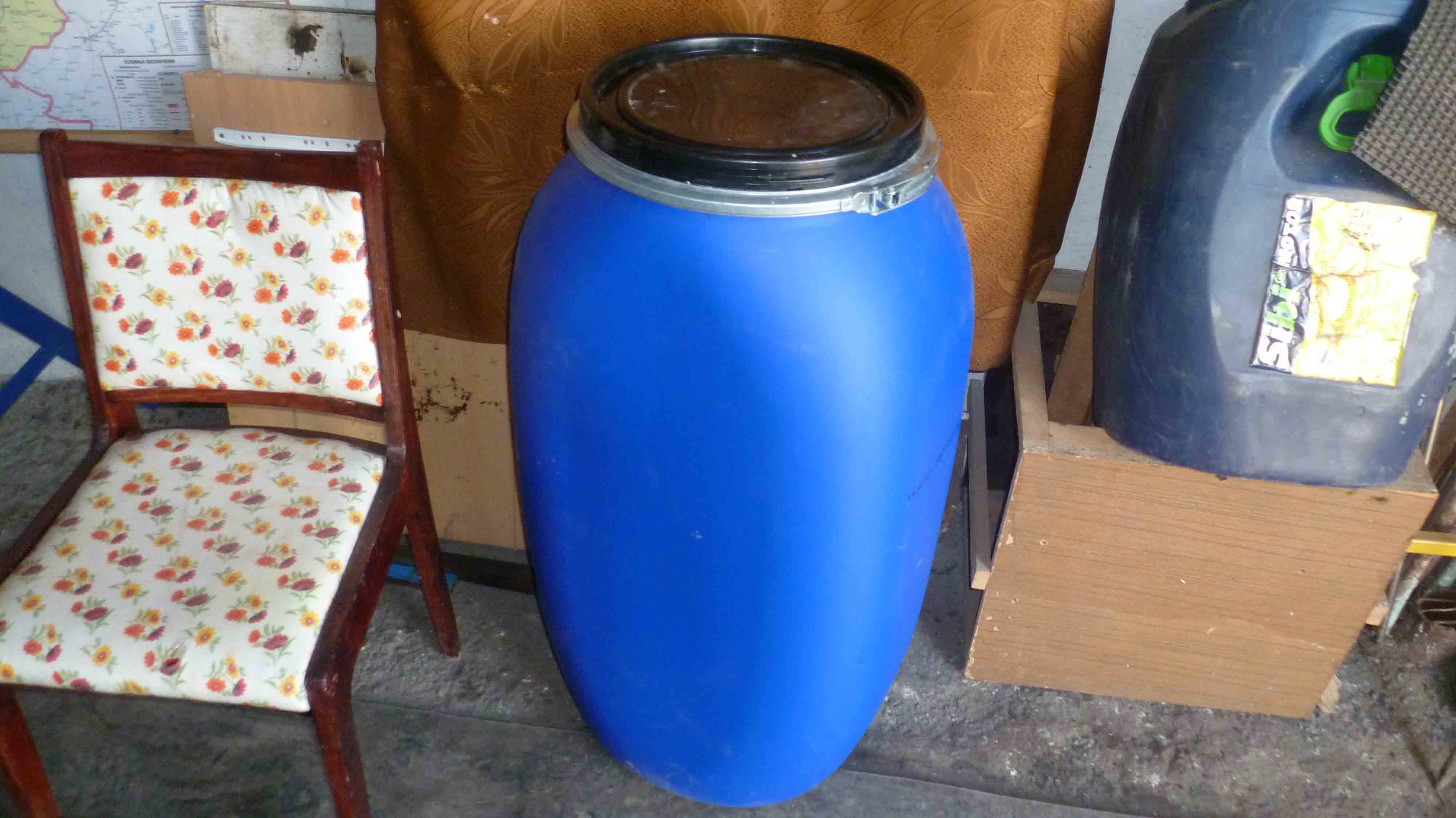 Купил себе одну. Бочка из-под клея ПВА, толстостенная, литров на 100, а может и больше. Не разглядывал.