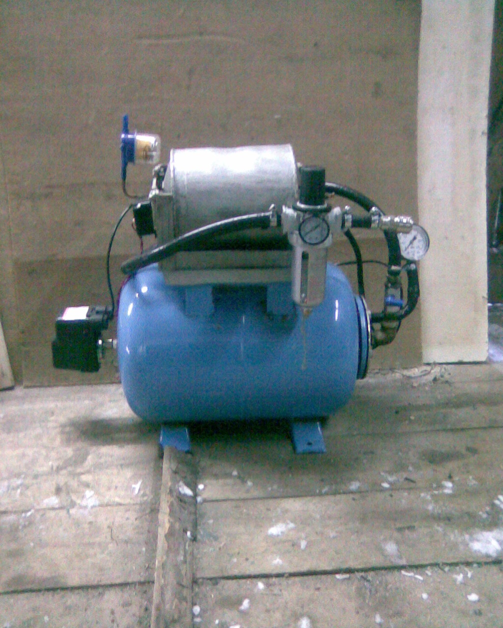 Вход воздуха через глушитель прямо в цилиндр, выход из цилиндра через глушитель во внутреннюю полость объемом примерно 2л, в ней масло плескается, улетает много при переливе, при нормальном уровне не пылит. Есть и 3-я трубка на корпусе заливная. Через определенное количество моточасов масло меняется, старое сливается, новое (нужный уровень) заливается. Компрессор лучше использовать вертикальный (с кулисой вместо кривошипа), он в 2-а раза быстрее качает.